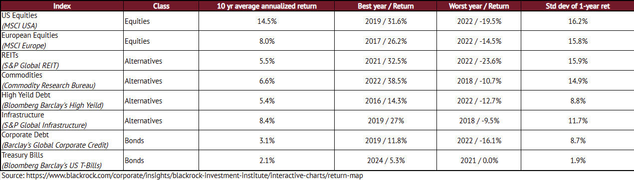 A BlackRock retrospective in 2025 highlights the diversity of performance and volatility within asset classes as measured by index (through September 2025), including some alternatives: (https://www.blackrock.com/corporate/insights/blackrock-investment-institute/interactive-charts/return-map):