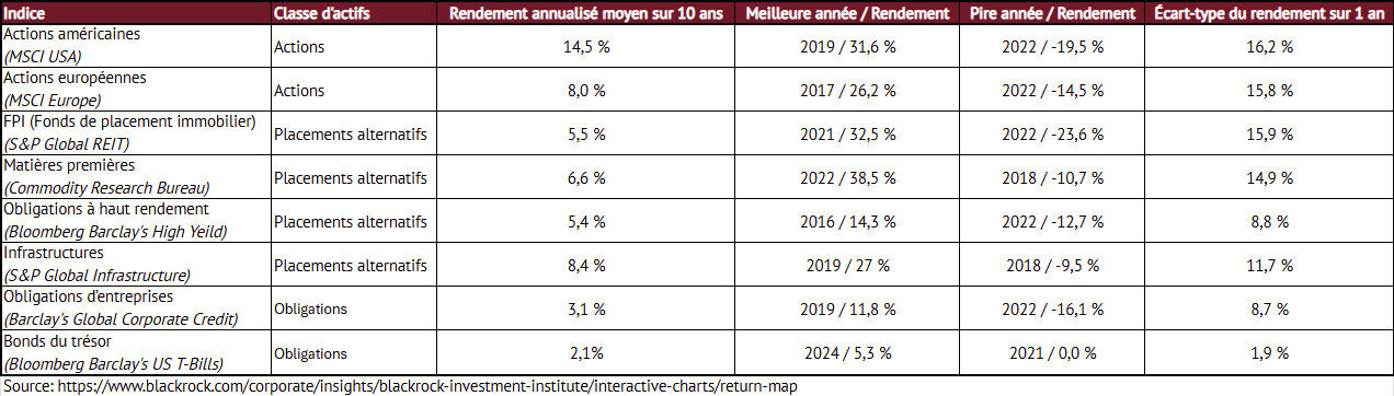 Une analyse rétrospective de BlackRock (septembre 2025) illustre la diversité de la performance et de la volatilité des différentes classes d’actifs, y compris certaines alternatives.